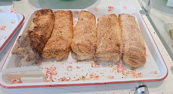Spinach and feta borek displayed in counter case. The boreka are shareable as a snack or enjoy as a light meal with salad or side.